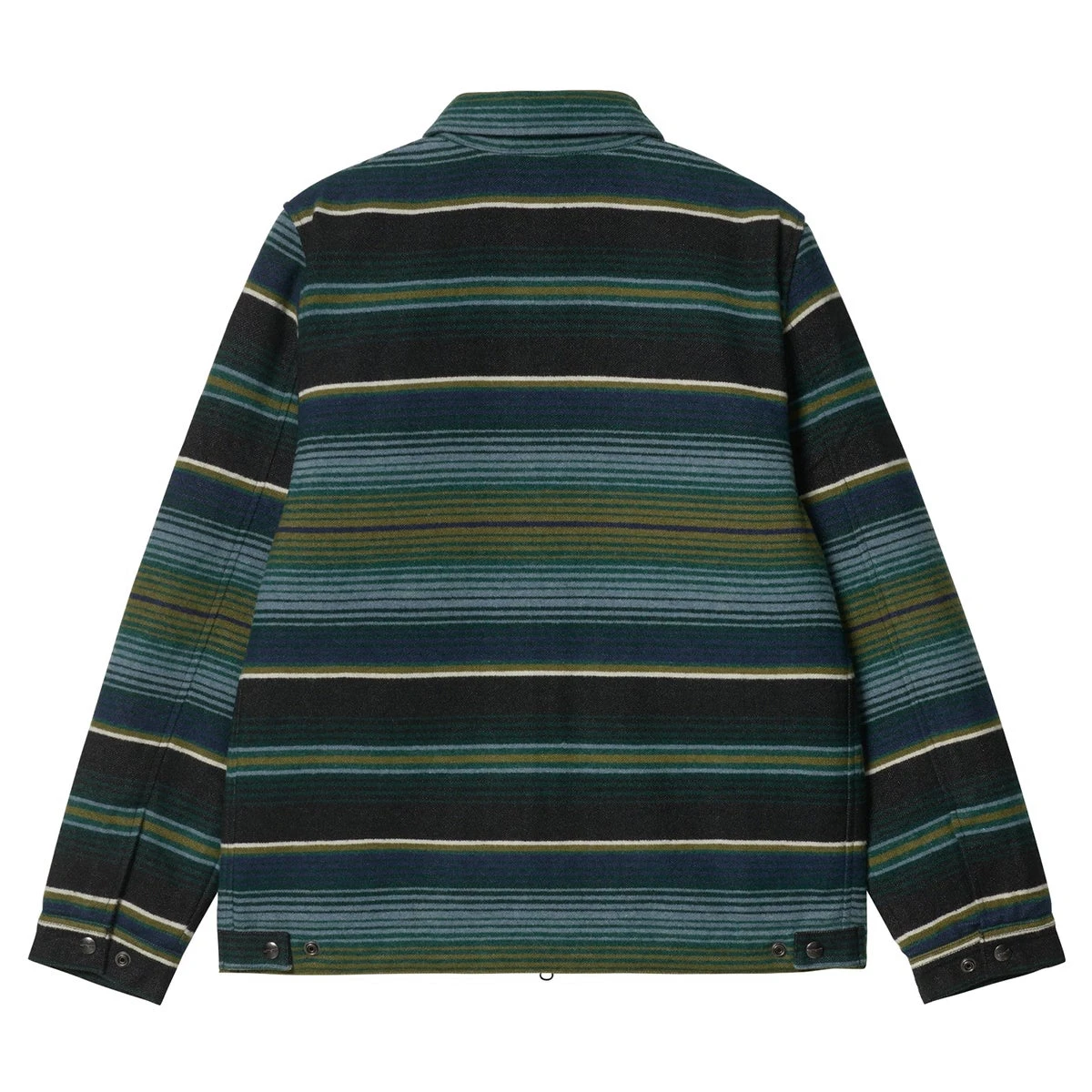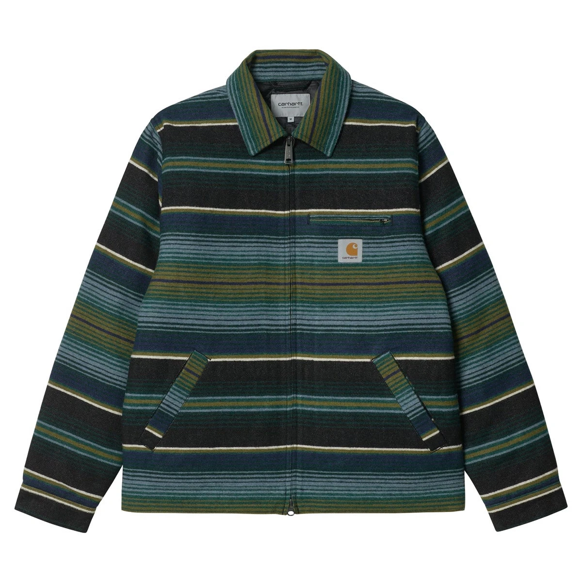 The Detroit Tuscon Jacket is constructed from a heavyweight wool blend fabric, which has been yarn dyed giving a unique western-inspired stripe effect. The garment features a diamond quilted nylon taffeta lining for added warmth and adjustable cuffs and bottom band for a perfect fit. Two front pockets and a single chest pocket with zip closure offer additional storage. Finished with a classic woven Carhartt WIP logo on the left chest.