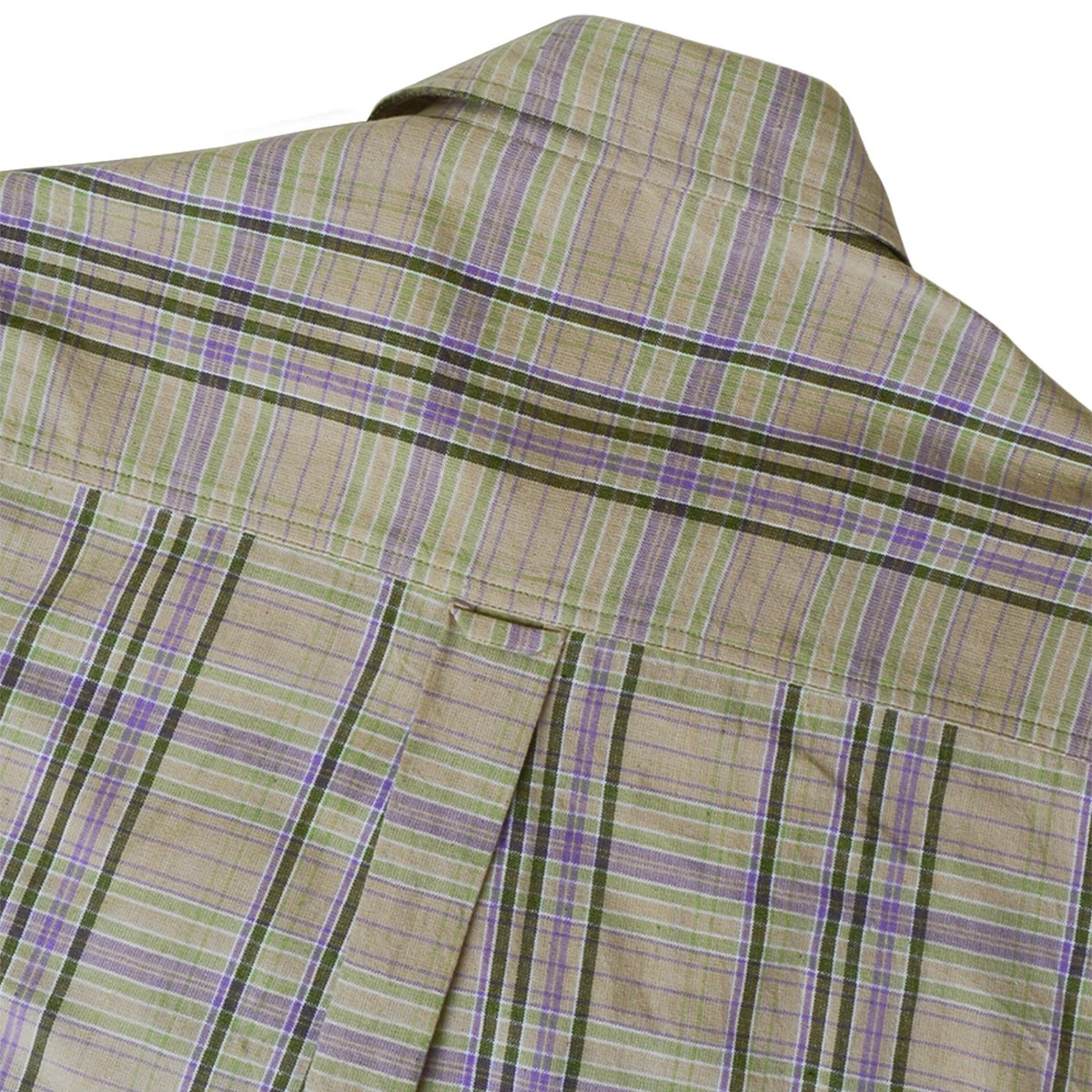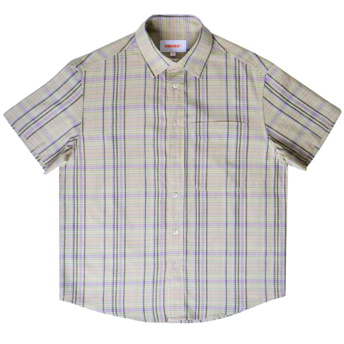 We reckon this is the season to start thinking about non-camp collar short sleeve shirts, like this one worn oversized unbuttoned, even over a longsleeve tee. Made in a hand-woven cotton madras fabric.