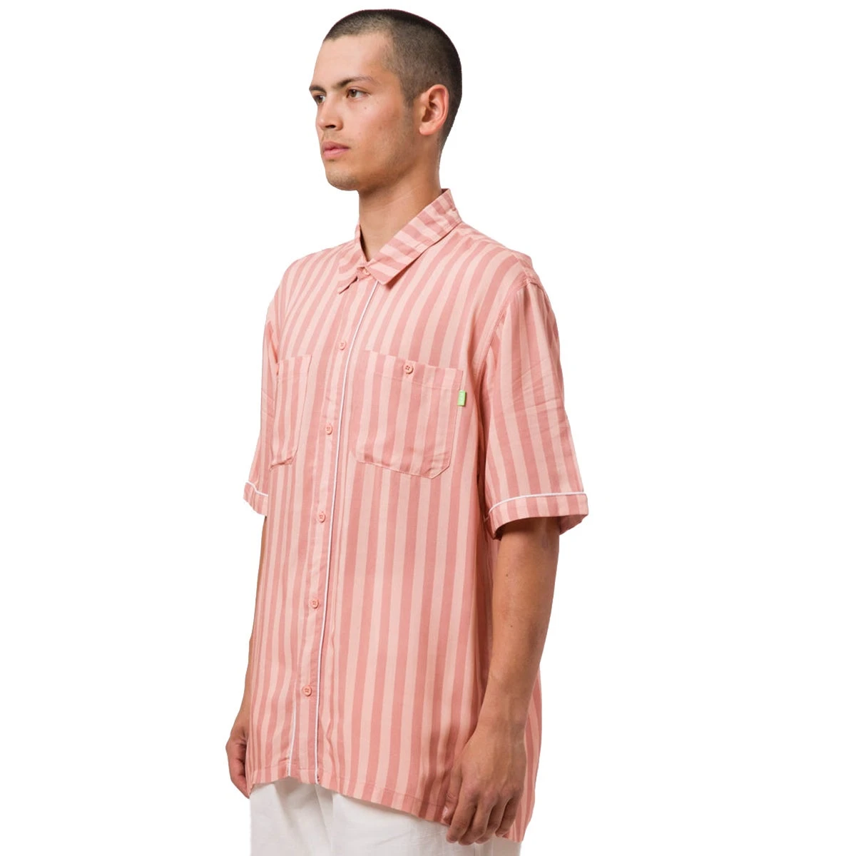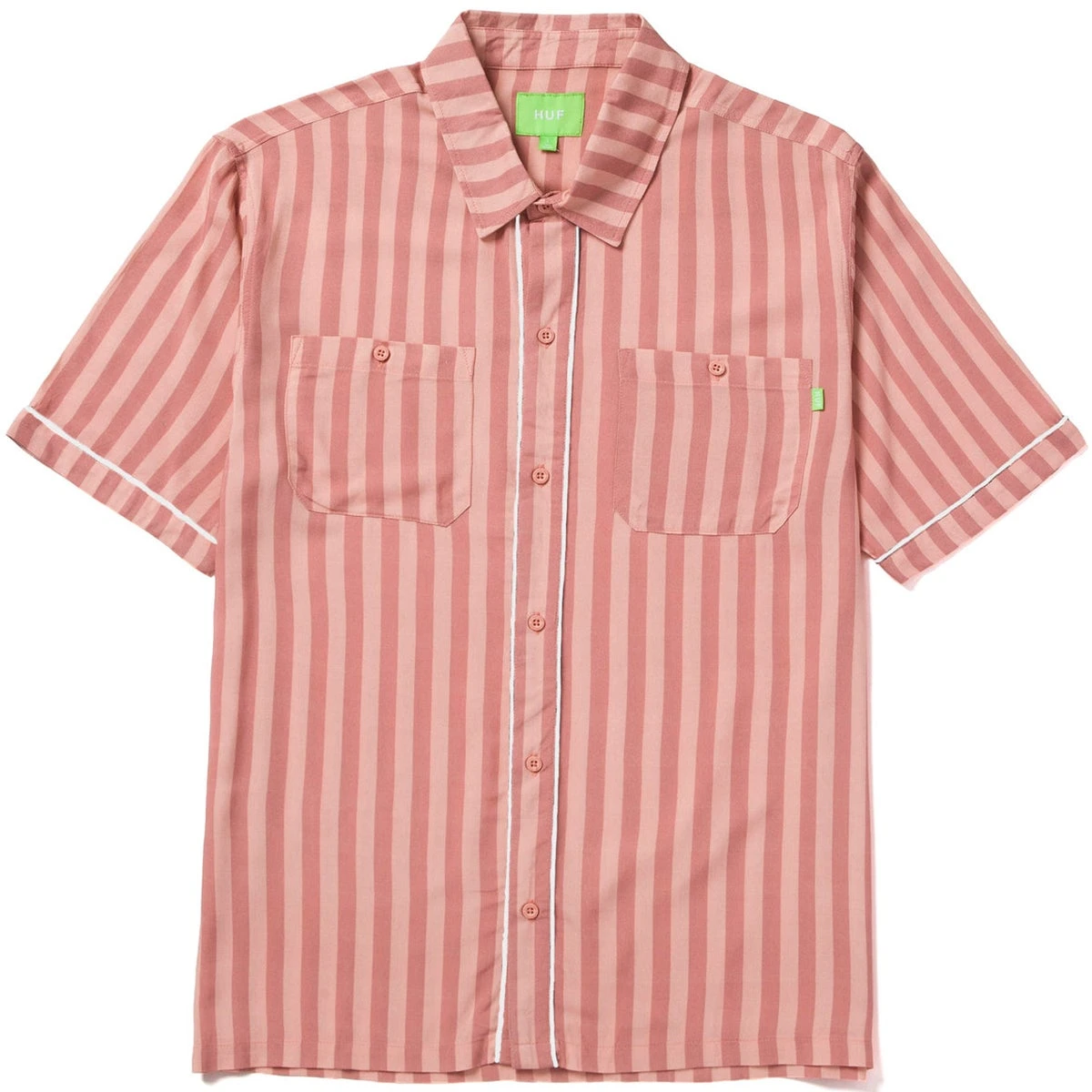 The Soho Short Sleeve Woven Top is made of breathable cotton poplin featuring tonal yarn-dyed striping for a clean and classic look. A nod to vintage baseball shirts, the button-up is finished with a spread collar, left chest pocket, and contrast piping at the cuffs and placket.