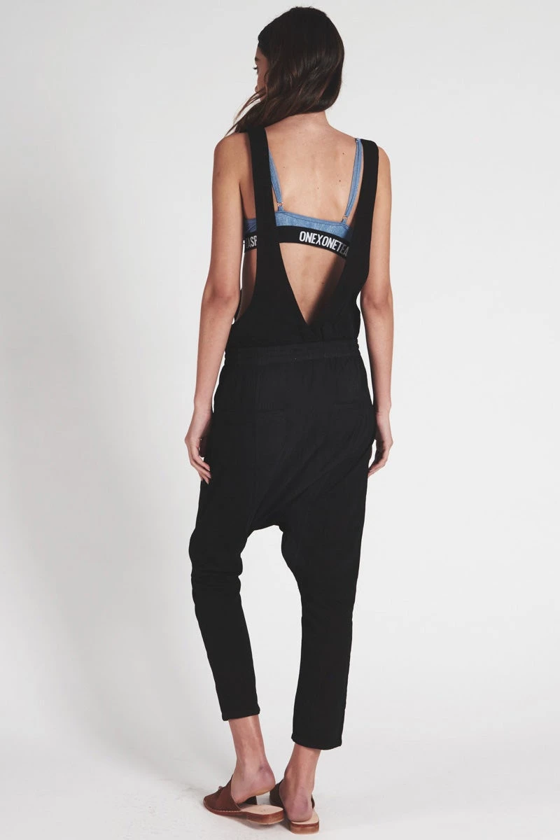 The OneTeaspoon Wanderer Overalls are a low-waisted, semi-relaxed, tapered leg overall in black. Slouchy short bib front. Bib designed to be worn under the bust and slouchy.