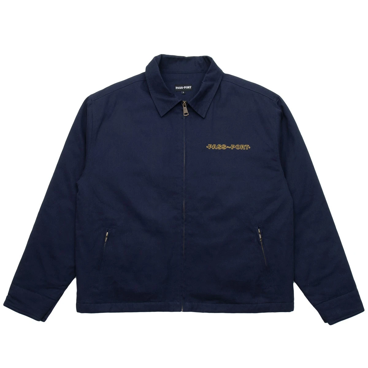 Pass~Port Emblem Appliqué workers jacket in navy from range #38. Made from 100% cotton twill shell and cotton poplin lining. This jacket also features embroidery on front and embroidery felt appliqué on the back in the classic Pass~Port worker jacket fit.