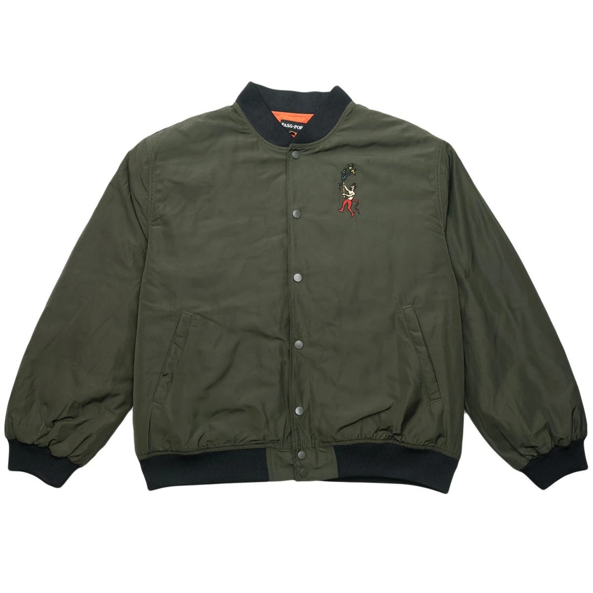 Pass~Port Gardening Satin jacket in forest green from range #39. Made from 100% polyester shell and 100% cotton poplin lining with cuffed sleeves and waist. The bomber jacket also has 3 pockets and embroidered front and silk appliqué back.