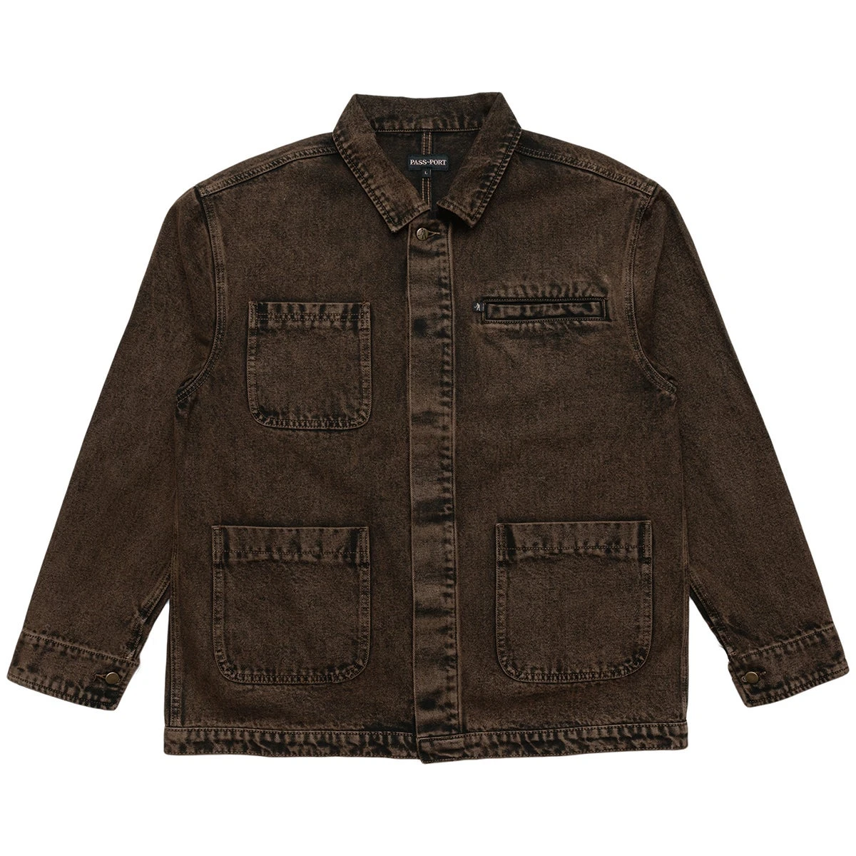 Pass~Port Workers Club Painters Jacket in brown over-dye from range #39. Made from 100% Cotton 16oz Rigid Denim and fine yarn for extra strength. The jacket features 4 external pockets and hidden buttons with the top button exposed.