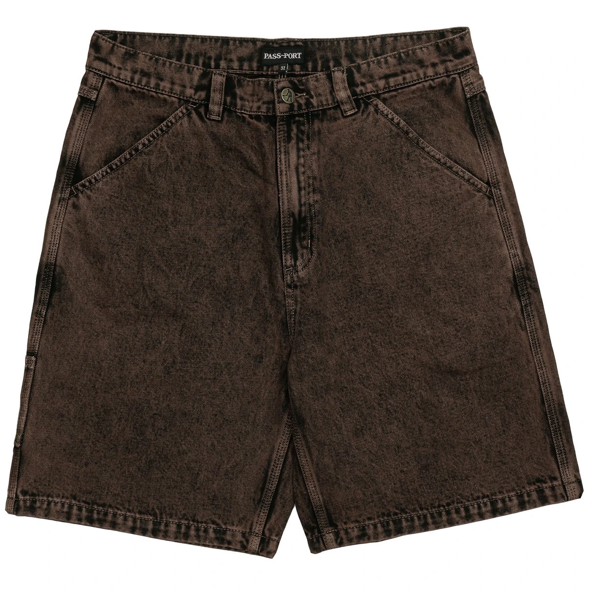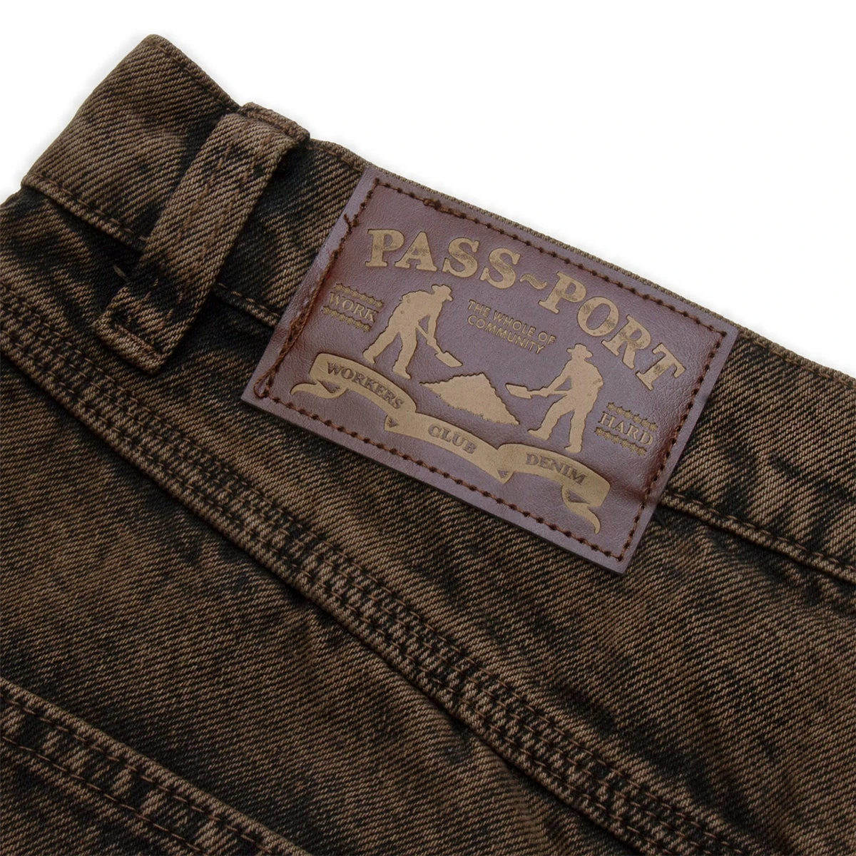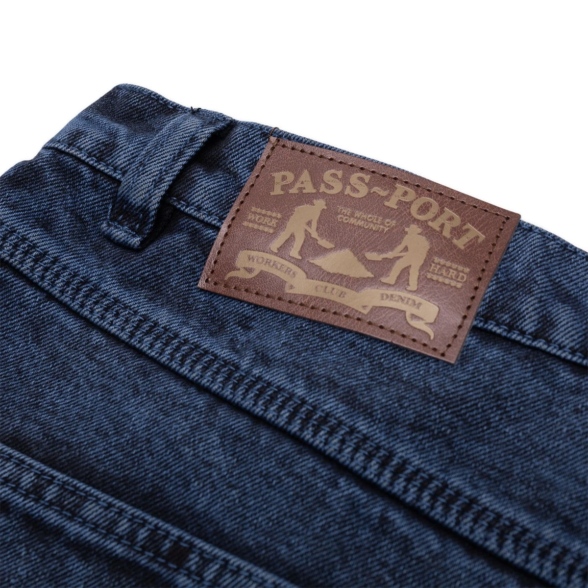Pass~Port Workers Club denim short from range #39. Made from 100% Cotton 16oz Rigid Denim and fine yarn for extra strength. The denim jort features digger embroidery on back pocket as well a faux leather label on waist.
