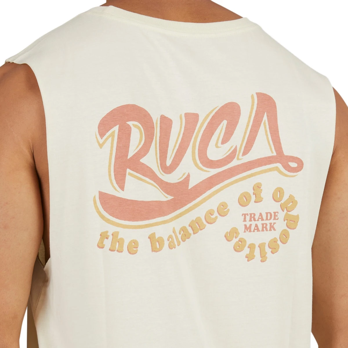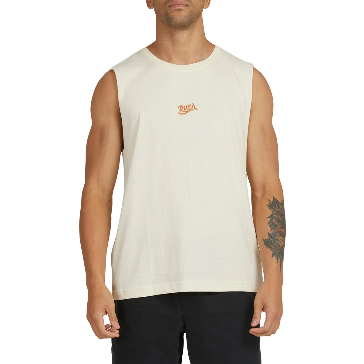 The rvca signage muscle tee is made from a lighter weight 100% organic cotton jersey and is built in our comfy regular fit. Features smaller embroidery at front, larger cracked ink screen-printed logo across the back, rvca woven label sewn at left side seam.